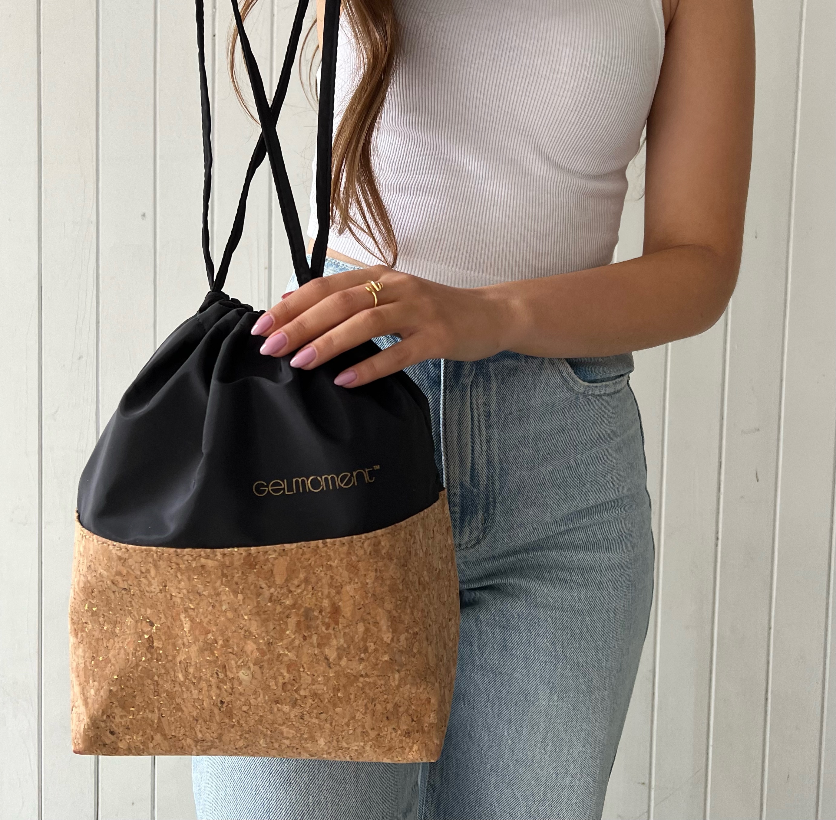 GelMoment’s Cork Drawstring Bag is as sturdy as it is stylish. Tote around your smaller essentials in this perfectly sized and uniquely designed drawstring bag. You have two colour schemes to choose from: cork base with multicolour speckles, pale pink vinyl upper body, and white GelMoment logo; or cork base with gold speckles, black vinyl upper body, and golden GelMoment logo.